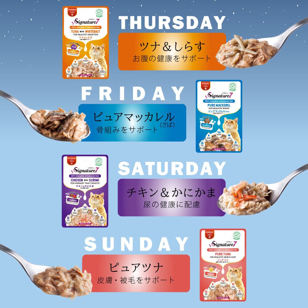 1週間毎日違う味が楽しめるバラエティ パック! おいしく食べて猫ちゃんのからだをトータルサポート。
